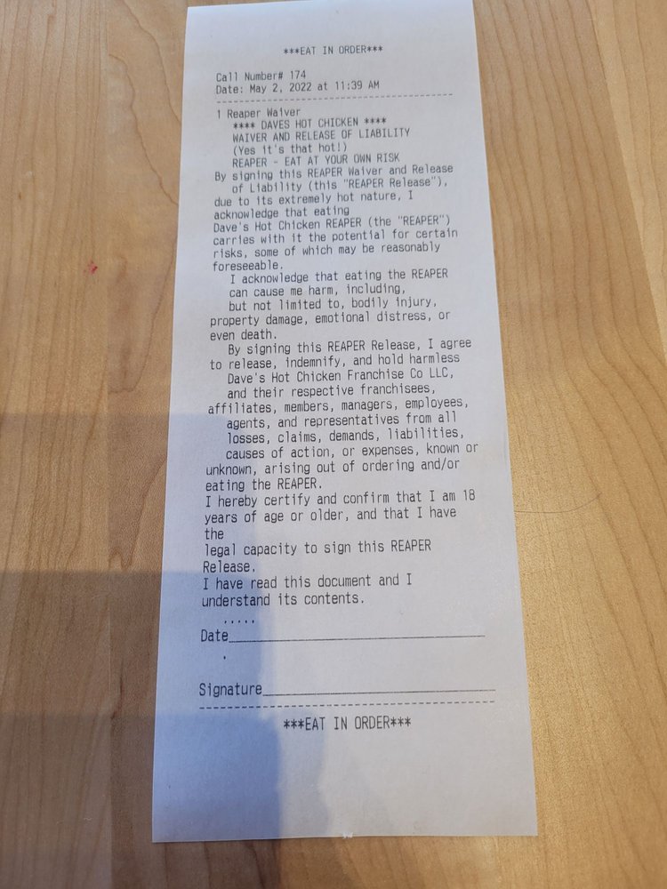 10 tenders (4 mild, 5 medium, 1 Reaper...are you ready?) **DAVE'S HOT CHICKEN REAPER WAIVERBy ordering and eating the REAPER, you acknowledge its extreme heat and potential risks, including injury, property damage, distress, or death.You release and hold Dave's Hot Chicken, its affiliates, and employees harmless from any claims related to consuming the REAPER, including REAPER ROULETTE.By ordering, you confirm you are 18+ and legally capable of accepting this waiver. Eat at your own risk!